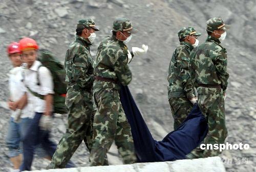 通往四川省汶川地震核心重災區(qū)映秀鎮(zhèn)的簡易公路5月17日打通后,各路專業(yè)救援隊繼續(xù)在廢墟中尋找可能的幸存者,部分解放軍與武警士兵則負責安置遇難者的遺體,以防止發(fā)生疫情。中新社發(fā) 任晨鳴 攝