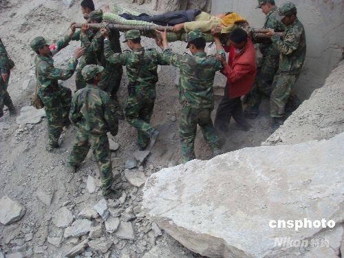 5月18日,成都軍區(qū)駐渝某集團(tuán)軍紅軍師步兵團(tuán)在汶川大地震茂縣懸崖峭壁的羌寨,冒著余震塌方解救兩位女傷員,傍晚成功送到前來(lái)支援的解放軍第二軍醫(yī)大學(xué)醫(yī)療隊(duì)。中新社發(fā) 賈國(guó)榮 攝
