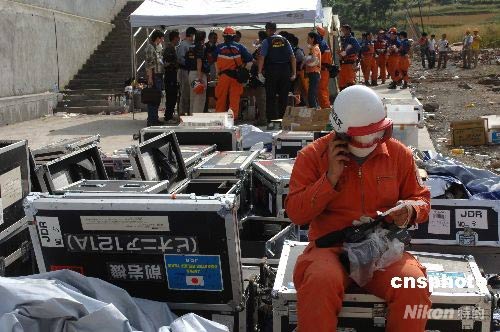 5月18日,日本國際救援隊一行二十余人到達(dá)中國四川北川地震現(xiàn)場——北川中學(xué),利用國際先進的探測儀器與中國兩支救援隊分別挖掘廢墟,救援受難學(xué)生。經(jīng)過共同探測,在沉入地下的樓層內(nèi)發(fā)現(xiàn)有三個生物體存在,但挖掘極為危險和困難,生者生命渺茫。圖為日本救援隊成員在休息時依然思考救援問題。中新社發(fā) 鄒憲 攝
