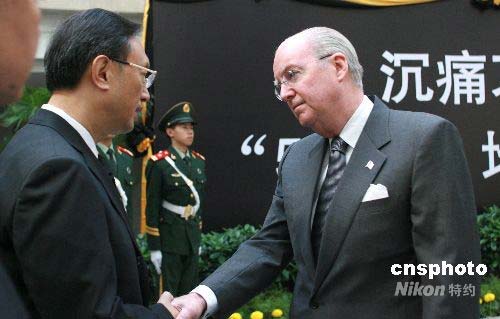 美國(guó)駐華大使雷德(右)前往吊唁時(shí),與中國(guó)外交部部長(zhǎng)楊潔篪握手,表示美方將增加對(duì)華救災(zāi)援助。中新社發(fā) 廖文靜 攝