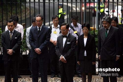 五月十九日下午,香港特別行政區(qū)行政長(zhǎng)官曾蔭權(quán)、政務(wù)司司長(zhǎng)唐英年、財(cái)政司司長(zhǎng)曾俊華及其他政府主要官員,在特區(qū)政府總部默哀三分鐘,對(duì)四川大地震遇難者表示深切哀悼。中新社發(fā) 武仲林 攝