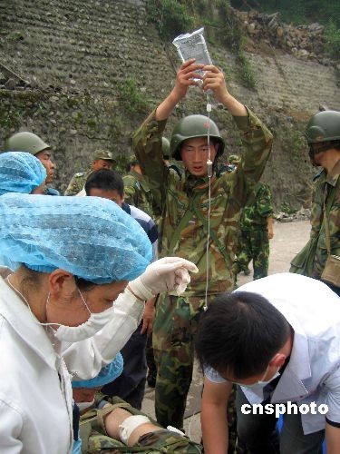 16日上午,師政治部主任高鵬帶領(lǐng)救援突擊隊(duì)和醫(yī)療小分隊(duì)172人,從綿竹市漢旺鎮(zhèn)出發(fā)向重災(zāi)區(qū)天池鄉(xiāng)幾個(gè)村里運(yùn)送救援物資,幫助群眾撤離震區(qū)。11時(shí)左右,當(dāng)部隊(duì)行至高橋以西500米處,突然發(fā)生余震,導(dǎo)致大量山石從山頂傾斜而下,直接威脅著正在這個(gè)路段通過的群眾。作訓(xùn)參謀祝紅杰突然發(fā)現(xiàn)一個(gè)孩子癱倒在石堆上,急忙上前搶抱他,孩子得救了,祝紅杰卻被亂石砸斷左腿,當(dāng)場倒地。作訓(xùn)參謀胡國才眼見一塊亂石砸向老人,極力將老人推到一邊,自己的頭部卻被亂石砸傷暈倒在地。同時(shí),該團(tuán)還有一名司務(wù)長和兩名戰(zhàn)士在救援中被泥石流砸傷…… 看到解放軍為救災(zāi)區(qū)群眾身負(fù)重傷,在現(xiàn)場的一些救災(zāi)志愿者迅即投入搶救部隊(duì)官兵的行動(dòng)中。運(yùn)送途中山路險(xiǎn)峻,他們拉一把、推一把,爭先恐后出把力氣。擔(dān)負(fù)救援撤離群眾任務(wù)的重慶市高新區(qū)人民醫(yī)院的醫(yī)護(hù)人員聞?dòng)嵑,一邊流著熱淚,一邊實(shí)施現(xiàn)場救護(hù),為他們贏得了寶貴的救治時(shí)機(jī)……