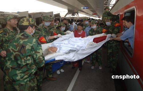 2008年5月19日,按照鐵道部的統(tǒng)一部署,成都鐵路局開行首趟運(yùn)送地震災(zāi)區(qū)受傷群眾專列,19日1O:20從綿陽(yáng)發(fā)車,當(dāng)日16:57到達(dá)重慶北站。運(yùn)送了206名地震受傷群眾及家屬前往重慶接受治療。該次專列專列車次為57005/6/5次路用傷員列車,編組19輛,全部為25G空調(diào)硬臥車。其中硬臥15輛并配備餐車及行李車!