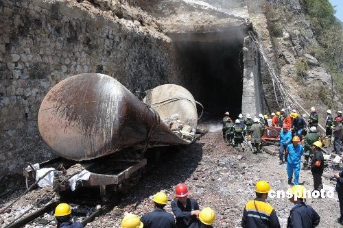 5月20日,寶成鐵路109號隧道搶險工作取得重大進展,隧道南口已拖出全部12節(jié)油罐車中的最后一節(jié)。截至當日下午15時,隧道南口已拖出14節(jié)受損車輛,其中包括全部12節(jié)油罐車,隧道北口拖出8節(jié)車輛。至此,109號隧道內(nèi)僅剩下18輛車未拖出。中新社發(fā) 唐振江 攝