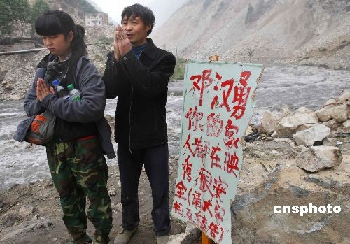 5月17日上午,在四川省汶川大地震中幸存的49歲映秀鎮(zhèn)頭道村農(nóng)民鄧云祥和女兒鄧小琴,在通往家鄉(xiāng)的必經(jīng)之地插上告示牌,企望失蹤的兒子鄧漢勇能夠平安歸來。任晨鳴 攝
