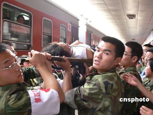 5月21日早7時許,一列運送四川地震傷員的專列徐徐駛?cè)胛靼部瓦\站,早已等待就緒的醫(yī)務(wù)人員馬上將傷員轉(zhuǎn)送至醫(yī)院接受治療。據(jù)了解,這列運送傷員的專列是20日下午4時從四川綿陽發(fā)車的,車上共有傷員248人,車上解放軍第四軍醫(yī)大學(xué)專門抽調(diào)了30余名醫(yī)務(wù)人員全程陪護(hù),到達(dá)西安客運站后,傷員將被救護(hù)車全部接到第四軍醫(yī)大學(xué)附屬醫(yī)院西安西京醫(yī)院和唐都醫(yī)院接收治療,目前西京醫(yī)院已經(jīng)提前準(zhǔn)備了500張床位以收治更多的地震傷員。中新社發(fā) 楊志濤 攝
