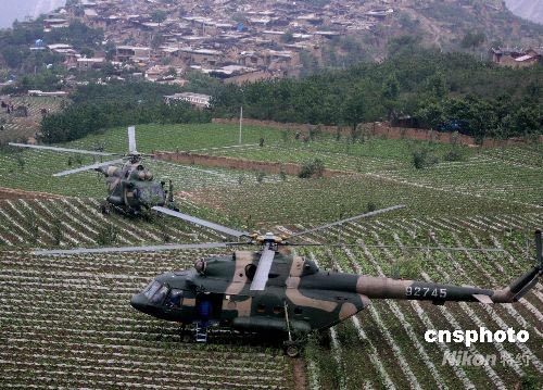成都軍區(qū)陸航團空降救兵到受災嚴重的高山羌寨,建立救災基地。中新社發(fā) 賈國榮 攝