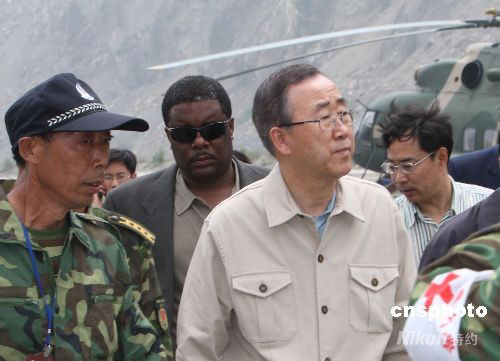 聯(lián)合國秘書長潘基文在映秀鎮(zhèn)察看地震災情