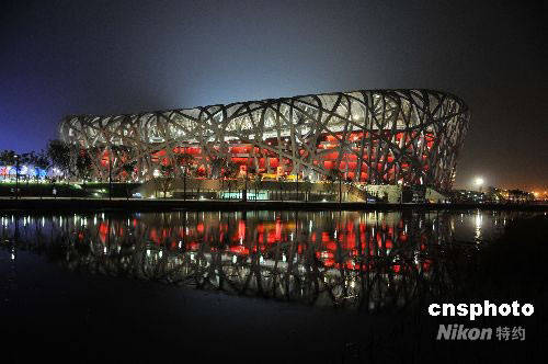 5月22日至25日,“好運(yùn)北京”2008中國田徑公開賽在國家體育場“鳥巢”舉行。比賽期間的夜晚,國家體育場燈火輝煌,周邊濕地湖水映襯著“鳥巢”,顯得分外秀麗。中新社發(fā) 馮軍 攝