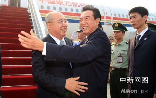 5月26日,中國國民黨主席吳伯雄抵達南京,中共中央臺灣工作辦公室主任陳云林到機場迎接。盛佳鵬 攝