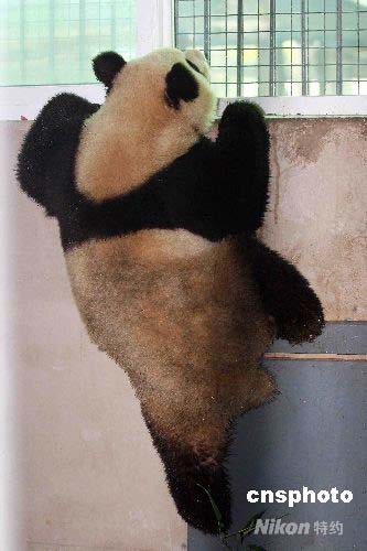 圖為大熊貓在往窗臺上攀爬。中新社發(fā) 富田 攝