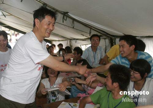 5月26日,濮存昕、林志穎、王寶強等藝人前往地震重災區(qū)什邡市一中學帳篷教室看望復課學生。這些藝人是參與由中國扶貧基金會主辦的“5·12青少年關愛基金——明星義工行動”的第一批明星義工。經歷過臺灣9·21大地震的林志穎作為臺灣第一位親赴內地參加賑災行動的藝人,認為災區(qū)的小朋友是最需要幫助的人。中新社發(fā) 張曉理 攝