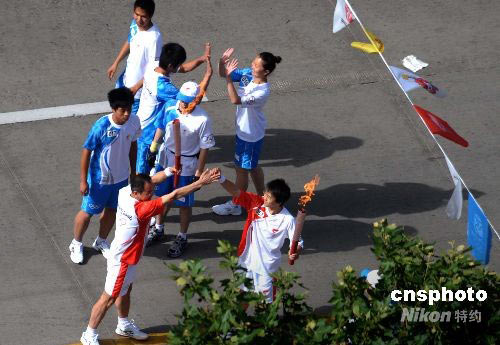 圖為火炬手和護(hù)跑手在交接時(shí)擊掌示意。中新社發(fā) 廖攀 攝