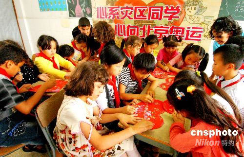 5月29日上午,浙江義烏群星學校舉行“心系災區(qū)學生 心向北京奧運” 慶“六一” 活動。全校2300多名學生與147名外籍學生,在各自的心愿卡上寫下祝福話語,祝愿四川地震災區(qū)小朋友“六一”快樂,祝愿北京奧運會圓滿成功。中新社發(fā) 張建成 攝
