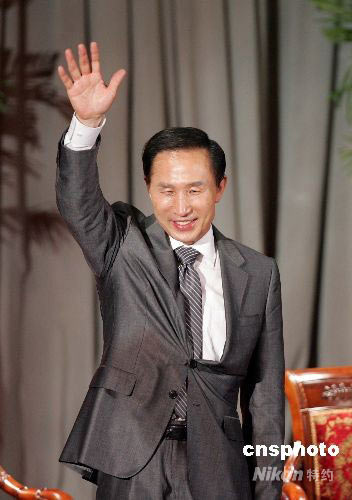 圖為韓國(guó)總統(tǒng)李明博在北大演講時(shí)向臺(tái)下學(xué)生揮手示意。中新社發(fā) 張宇 攝