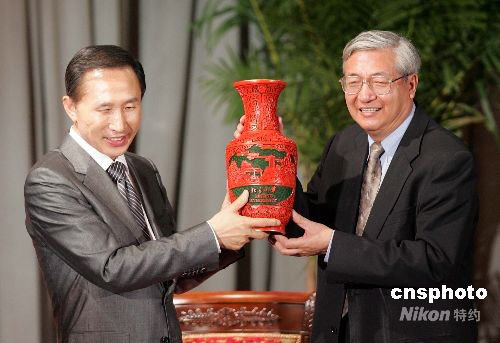 圖為北京大學(xué)校長許智宏(右)向李明博贈(zèng)送禮物。中新社發(fā) 張宇 攝