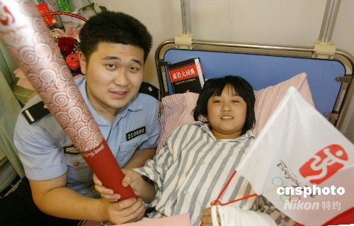 田野,是南京市公安局華僑路派出所的一名民警,也是北京奧運(yùn)會(huì)的火炬手。5月29日,他和他的同事帶著奧運(yùn)火炬來(lái)到江蘇省人民醫(yī)院愛心病房,看望6位在四川地震中受災(zāi)的孩子,讓他們近距離的看到了“祥云”火炬,并告訴他們?cè)诨鹁鎮(zhèn)鬟f中大家對(duì)災(zāi)區(qū)的祝愿。中新社發(fā) 吳俊 攝