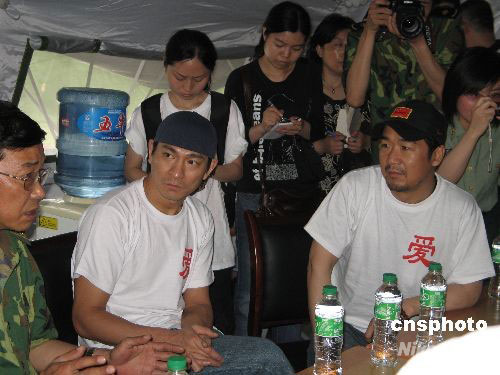 5月29日下午3時許,劉德華、張國立、鄭秀文、葛優(yōu)、馮小剛、陳道明等人來到收治了3000余名地震傷員的成都軍區(qū)總醫(yī)院進行慰問。其間,劉德華、張國立、陳道明等人分別發(fā)言。一句句鼓勵的話語,一聲聲親切的問候,給傷員和醫(yī)護人員帶來了快樂和勇氣。據(jù)了解,這是“5.12關愛行動”的第二站, 此次活動由劉德華和張國立等人發(fā)起。中新社發(fā) 朱琥姚遠 攝