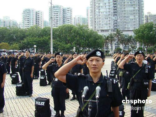 5月31日上午8時,海口200名特警南港碼頭登船出征,奔赴四川抗震救災。此次出征特警要到達四川德陽市,為期3個月,主要職責是協(xié)助當?shù)毓矙C關巡邏防控、打擊違法犯罪活動、恢復110、119、122接處警和服務災民工作。中新社發(fā) 付美斌 攝