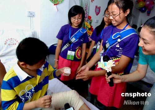 澎湖馬公小學(xué)音樂班的3位同學(xué)向在此接受治療的四川綿竹9歲的丁磊送上節(jié)日禮物和祝福。中新社發(fā) 劉可耕 攝