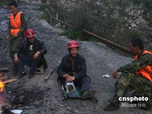 從一名被營救者口中得知有三名礦工被困礦區(qū)后,中國空降兵某部特種大隊于5月31日上午,乘坐香港特區(qū)政府飛行服務(wù)隊的直升機(jī)前往綿竹清平鄉(xiāng)山里搜救3名川龍有限公司的礦工。當(dāng)日兩名受傷礦工被找到。由于天氣原因,6月1日才被飛機(jī)運(yùn)出。圖為礦工被救后等待飛機(jī)救援。中新社發(fā) 李磊 攝