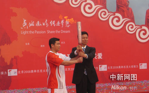 六月二日上午八時(shí)十二分,北京奧運(yùn)會(huì)火炬接力荊州傳遞開始,該市傳遞路線全長為十八點(diǎn)八公里。圖為體操奧運(yùn)冠軍鄭李輝從中共荊州市委書記應(yīng)代明手中接過火炬開始第一棒傳遞。 中新社發(fā) 艾啟平 攝