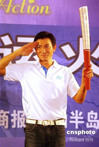 6月3日,在海南三亞進(jìn)行的“愛心呵護(hù) 陽光行動”愛心大使奧運(yùn)火炬義拍活動中,香港藝人劉德華拿出自己在香港傳遞奧運(yùn)圣火時的奧運(yùn)火炬進(jìn)行現(xiàn)場義拍,拍得人民幣190萬元,拍賣所得將全部用于四川地震災(zāi)區(qū)教育事業(yè)。圖為劉德華在展示自己的奧運(yùn)火炬。中新社發(fā) 尹海明 攝