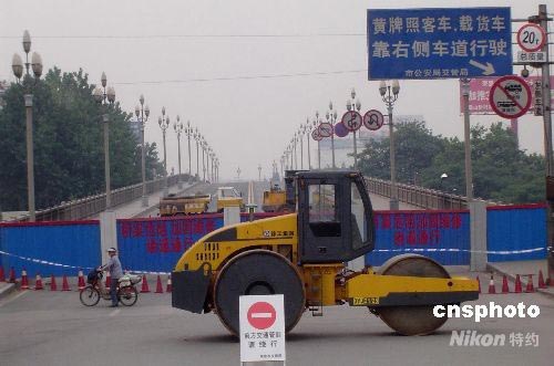 6月2日凌晨三時,因小商品攤位發(fā)生火災(zāi)導(dǎo)致南京長江大橋南引橋第一橋孔嚴重受損,大橋?qū)嵭薪煌ü苤,除公交車及小型客車可繞行上橋外,其他車輛二十四小時禁止通行。受此影響,當(dāng)日南京碼頭輪渡運送過江乘客達十萬人以上。圖為南京長江大橋南引橋設(shè)置的禁止交通圍檔。中新社發(fā) 王國安 攝