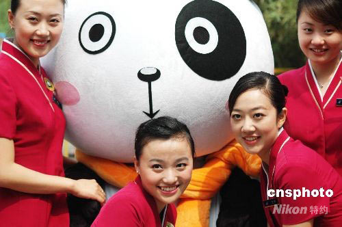 6月5日上午,8只四川臥龍大熊貓首次在北京動物園新家與游客見面。前來參觀的群眾用不同方式表達對大熊貓的喜愛。圖為參加首日見面儀式的南方航空公司空姐與大熊貓吉祥物合影。中新社發(fā) 魏瑋 攝