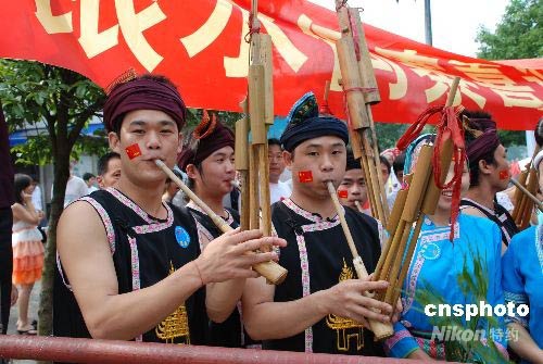 奧運(yùn)圣火在桂林傳遞,來自桂林龍勝銀水侗寨的小伙子們吹起蘆笙,迎接奧運(yùn)圣火的到來。中新社發(fā) 劉桂陽 攝