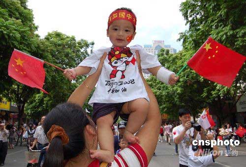 6月7日,北京奧運(yùn)火炬在廣西南寧傳遞,當(dāng)?shù)孛癖姛崆樗苹鹣灿セ。中新社發(fā) 劉萬(wàn)強(qiáng) 攝