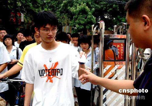 參加首日高考的福州考生步入福州銅盤中學(xué)考點(diǎn)時(shí),主動出示準(zhǔn)考證和身份證。中新社發(fā) 劉可耕 攝