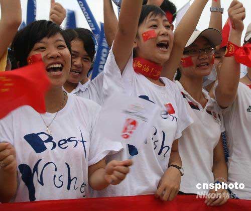 當(dāng)?shù)孛癖娧赝緹崆闉榛鹁媸、北京奧運(yùn)會(huì)加油。中新社發(fā) 林艷華 攝