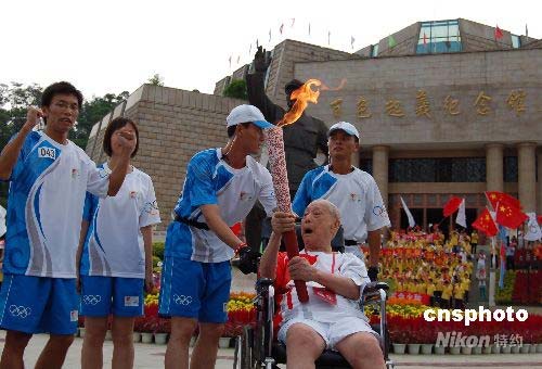 6月8日下午,奧運(yùn)圣火在廣西百色市傳遞,當(dāng)?shù)啬挲g最大的火炬手、九十二歲的老紅軍牟一琳坐在輪椅上,在百色起義紀(jì)念館前舉起了“祥云”火炬。百色是鄧小平軍事生涯的起點(diǎn),一九二九年鄧小平在百色領(lǐng)導(dǎo)發(fā)動(dòng)了著名的百色起義。中新社發(fā) 劉萬強(qiáng) 攝