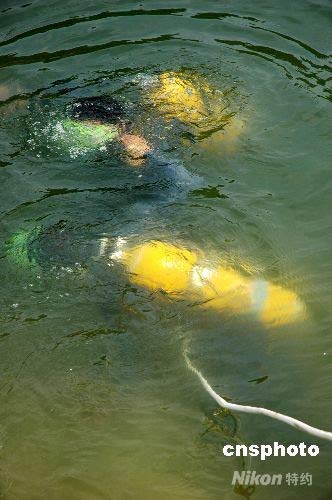 經(jīng)過(guò)4名潛水員近2個(gè)小時(shí)的連續(xù)作業(yè),終于將水庫(kù)最底下的2個(gè)放水口拉開(kāi)。中新社發(fā) 李唐 攝