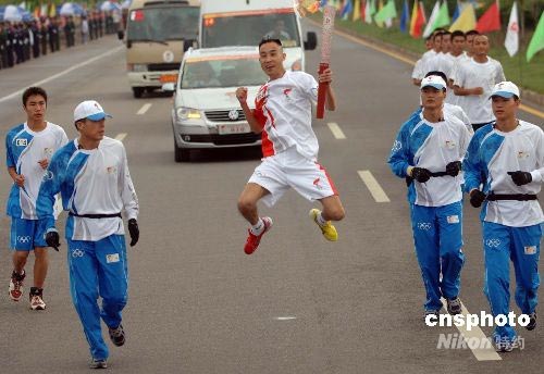 6月10日,奧運(yùn)圣火在云南麗江傳遞,53號(hào)火炬手馬亮武傳遞火炬時(shí)騰空歡愉。中新社發(fā) 廖攀 攝