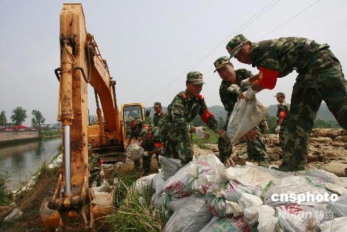 6月10日中午,四川省遂寧市遂寧軍分區(qū)、武警遂寧市支隊(duì)、遂寧消防組織的數(shù)百名參戰(zhàn)官兵正在加緊筑壩,以截?cái)嗵萍疑窖呷鬯魅胨鞂幨谐菂^(qū),保衛(wèi)遂寧40余萬(wàn)人的生活飲用水源不被污染。當(dāng)天上午,據(jù)唐家山堰塞湖排險(xiǎn)水情測(cè)報(bào)指揮中心消息,唐家山堰塞湖泄流槽水勢(shì)較猛,下游水位增長(zhǎng)較快。中新社發(fā) 鐘 敏 攝