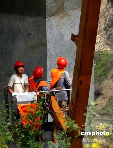 勘測(cè)人員查看四川震區(qū)橋梁受損情況