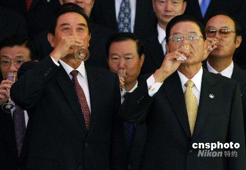 海峽兩岸關(guān)系協(xié)會(huì)會(huì)長(zhǎng)陳云林(右)與臺(tái)灣海峽交流基金會(huì)董事長(zhǎng)江丙坤在簽署“兩岸周末包機(jī)”和“大陸居民赴臺(tái)旅游”協(xié)議后,共飲“慶功酒”。中新社發(fā) 任晨鳴 攝