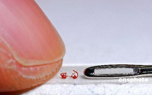 微雕大師用紅翡翠石粉末雕刻的世界最小茶壺