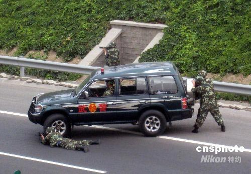 13日,中國“長城5號”國家級反恐怖演習(xí)科目之一的處置劫持人質(zhì)事件,在人員入出境最頻繁的北京首都國際機(jī)場附近進(jìn)行。演習(xí)過程中,三輛運(yùn)動員班車行至首都機(jī)場高速北線某橋面時,被兩輛面包車阻停,“恐怖分子”將車上人員劫為人質(zhì)。中新社發(fā) 于立霄 攝