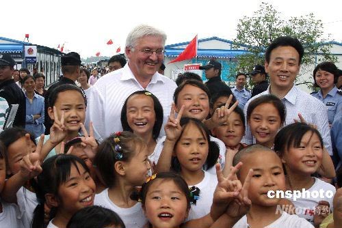 德國副總理兼外長施泰因邁爾來到四川地震災區(qū)都江堰市“勤儉人家”安置點,看望安置點的居民和帳篷學校的孩子們。圖為施泰因邁爾和孩子們合影留念。中新社發(fā) 黃榮 攝