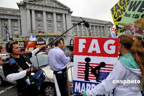 地時(shí)間六月十六日下午五時(shí),舊金山市政府內(nèi)舉行了當(dāng)天唯一一對(duì)同性戀伴侶的婚禮,而市府大廈外面,支持和反對(duì)的人群相互抗?fàn)。中新社發(fā) 陳鋼 攝
