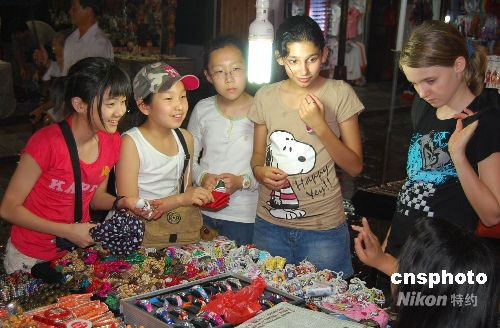 中外小朋友在廣西陽(yáng)朔西街購(gòu)物。中新社發(fā) 龍燕秀 攝