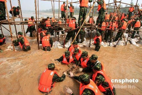 6月18日,山東省軍區(qū)和濟南警備區(qū)在濟南西郊玉清湖附近黃河大堤舉行大型防汛搶險演練。來自濟南市的10支民兵預(yù)備役部隊、黃河專業(yè)搶險隊等共1300余名隊員演練了水情偵察、封堵決口、爆破分洪、管涌搶護、堤壩搶護、緊急營救、搶筑子堤等七項防汛搶險科目。中新社發(fā) 周青先 攝