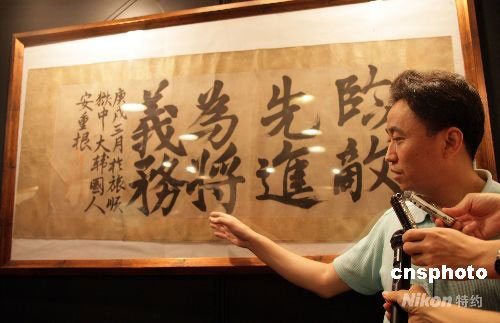 預展中,一幅紙質(zhì)黃舊的書法作品——“臨敵先進,為將義務”吸引眾人的眼球,這是當年刺殺伊藤博文的韓國民族英雄安重根在獄中的絕筆書。圖為工作人員講解這幅書法作品的歷史價值。中新社發(fā) 趙雋 攝