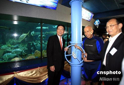 香港特區(qū)商務(wù)及經(jīng)濟(jì)發(fā)展局局長馬時(shí)亨(左)、全國水生野生動(dòng)物保護(hù)分會會長李彥亮(右)、海洋公園主席盛智文在海洋公園海洋館為中華鱘新居揭幕。中新社發(fā) 王麗南 攝