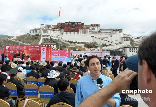 圖:境外記者現(xiàn)場報道奧運(yùn)火炬?zhèn)鬟f