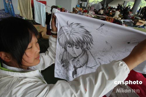北川縣一位家園被毀的女孩在救援組織贈(zèng)送的文化衫上繪出自己喜愛(ài)的卡通人像。中新社發(fā) 賈國(guó)榮 攝
