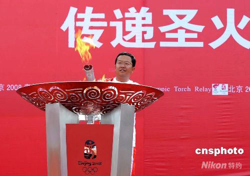 6月22日10時(shí)42分,末棒火炬手——“全國(guó)十大杰出青年”李小松在格爾木中心廣場(chǎng)點(diǎn)燃圣火盆,北京奧運(yùn)火炬接力格爾木站傳遞活動(dòng)圓滿結(jié)束。中新社發(fā) 廖攀 攝